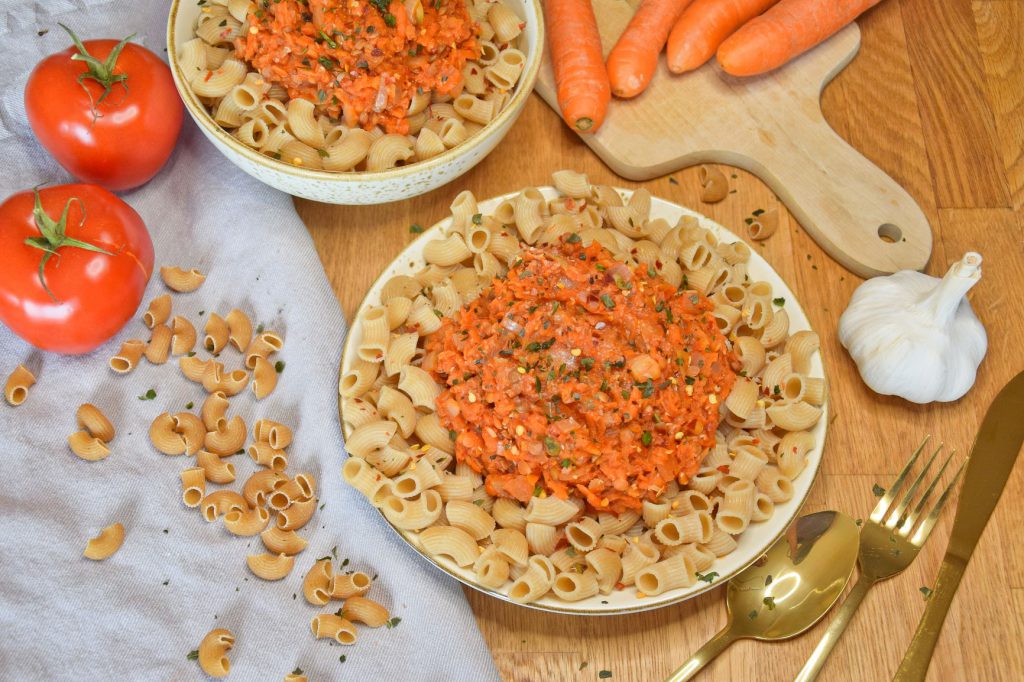 Die Möhren in feine Streifen und die Champignons in feine Scheiben schneiden, beides gut mit anbraten.